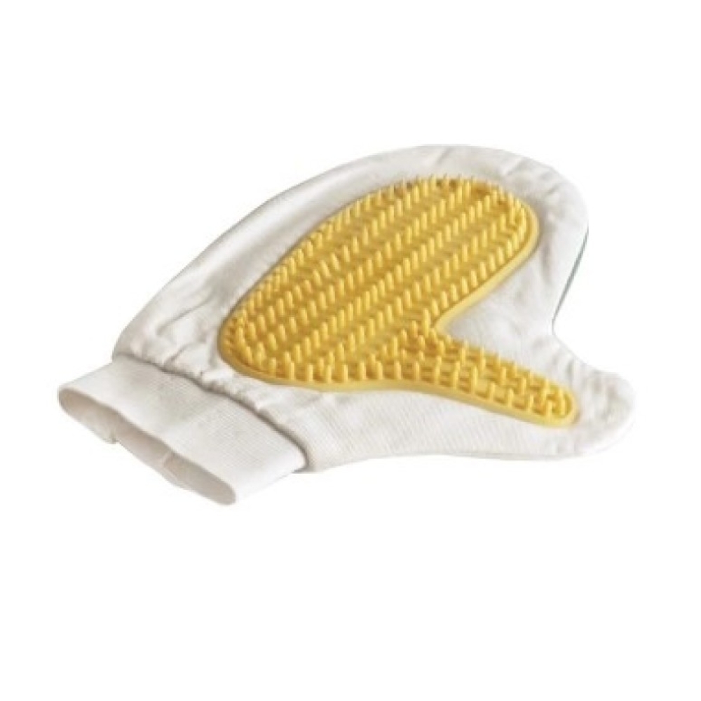 Guanto spazzola in tessuto con palmo in latex; ideale per rimuovere i peli senza strapparli, con polso regolabile, facile da pulire.